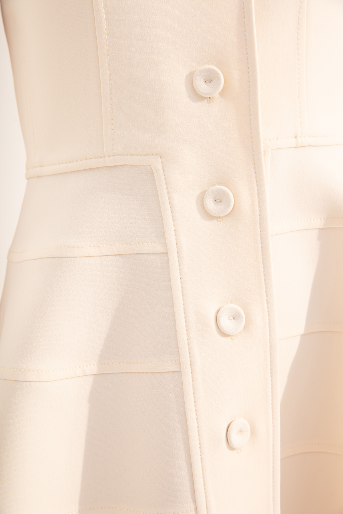 Önden kumaş kaplama düğmeleri, elbisenin tasarımı ile bütünleşerek, elbisenin zarafetini tamamlar.